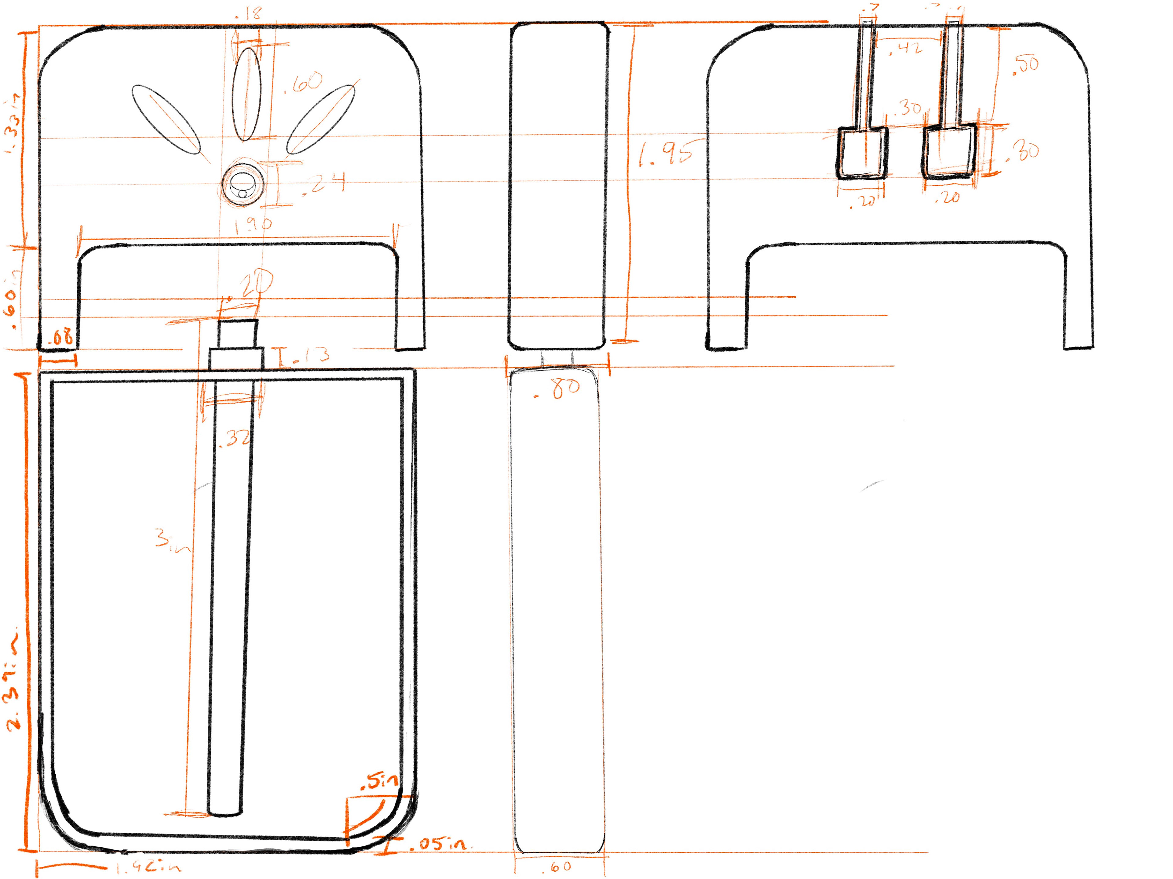 Using the measurements I gathered from the Power Mist sanitizer, I was able to draft a final orthographic sketch of the room mist device.